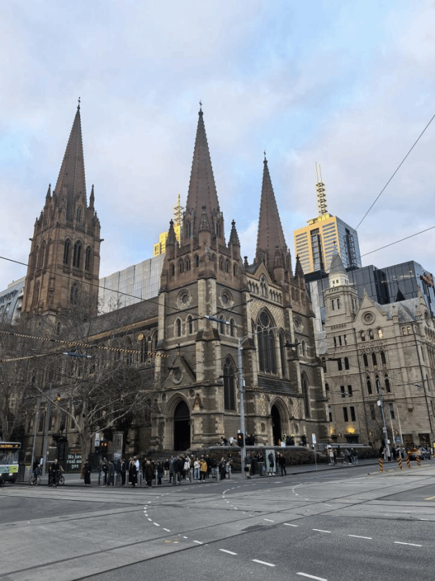 弗林德斯火车站对面是极具现代感的联邦广场,斜对面则是圣保罗大教堂。圣保罗大教堂建于1891年,是墨尔本最早的英国式教堂,也是墨尔本市区内最著名的建筑,是墨尔本早期移民对英国文化的延续,也是城市繁荣的象征。