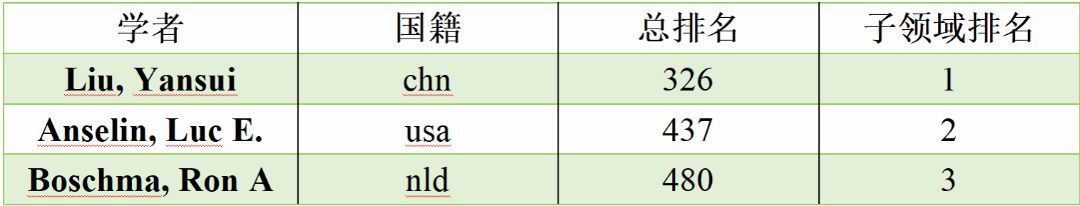 数据显示,榜单前列由多位国际著名学者领衔。其中,BetWay体育平台学术副校长、地理科学与工程学部主任刘彦随教授在全球地理学者中排名第一;美国芝加哥大学空间数据科学中心的Luc E. Anselin教授(空间计量经济学代表人物)和荷兰乌得勒支大学的Ron A. Boschma教授(演化经济地理学代表人物)分列二、三位。