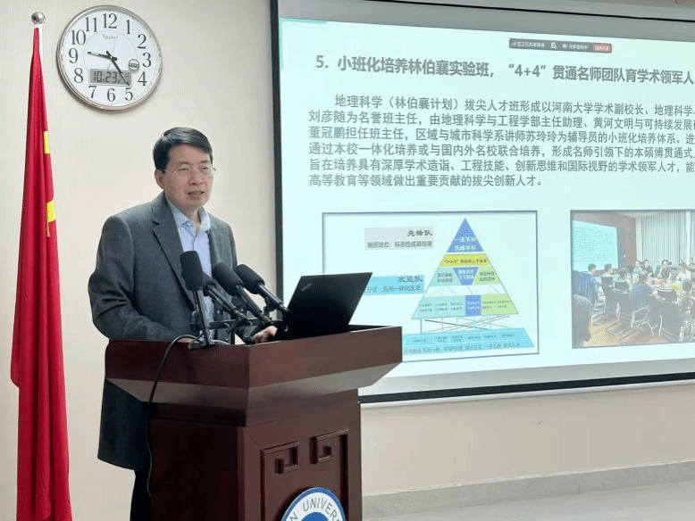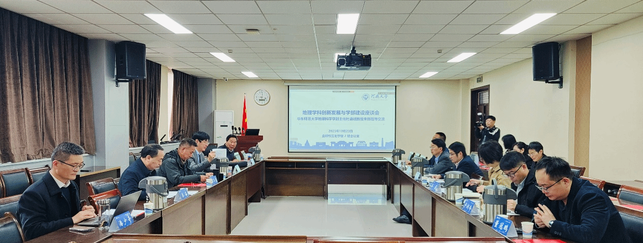 傅声雷代表学部对杜德斌教授的到来表示热烈欢迎。他表示,此前学部与华东师范大学地球科学学部的交流让我们受益匪浅,此次莅临指导定能进一步深化交流合作并为我部提供具体的学科建设经验,同时对以往的指导和帮助表示由衷的感谢。随后,傅声雷介绍了我部地理学科的发展情况,对“三院一室一中心”的组织架构、学科“36X”体系、空间基准全国重点实验室建设、河南大别山森林生态系统国家野外科学观测研究站功能等进行了详细介绍;围绕“地理科学工程化、地理工程学科化”进行学科建设理念阐述,介绍了国家乡村振兴(兰考)研究院、地理工程小院等地理工程建设举措。最后,他介绍了学部近期的研究成果和建设成效,希望杜德斌教授进一步深入指导学科建设。