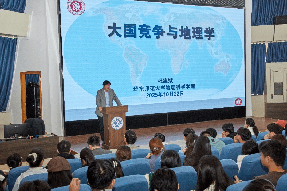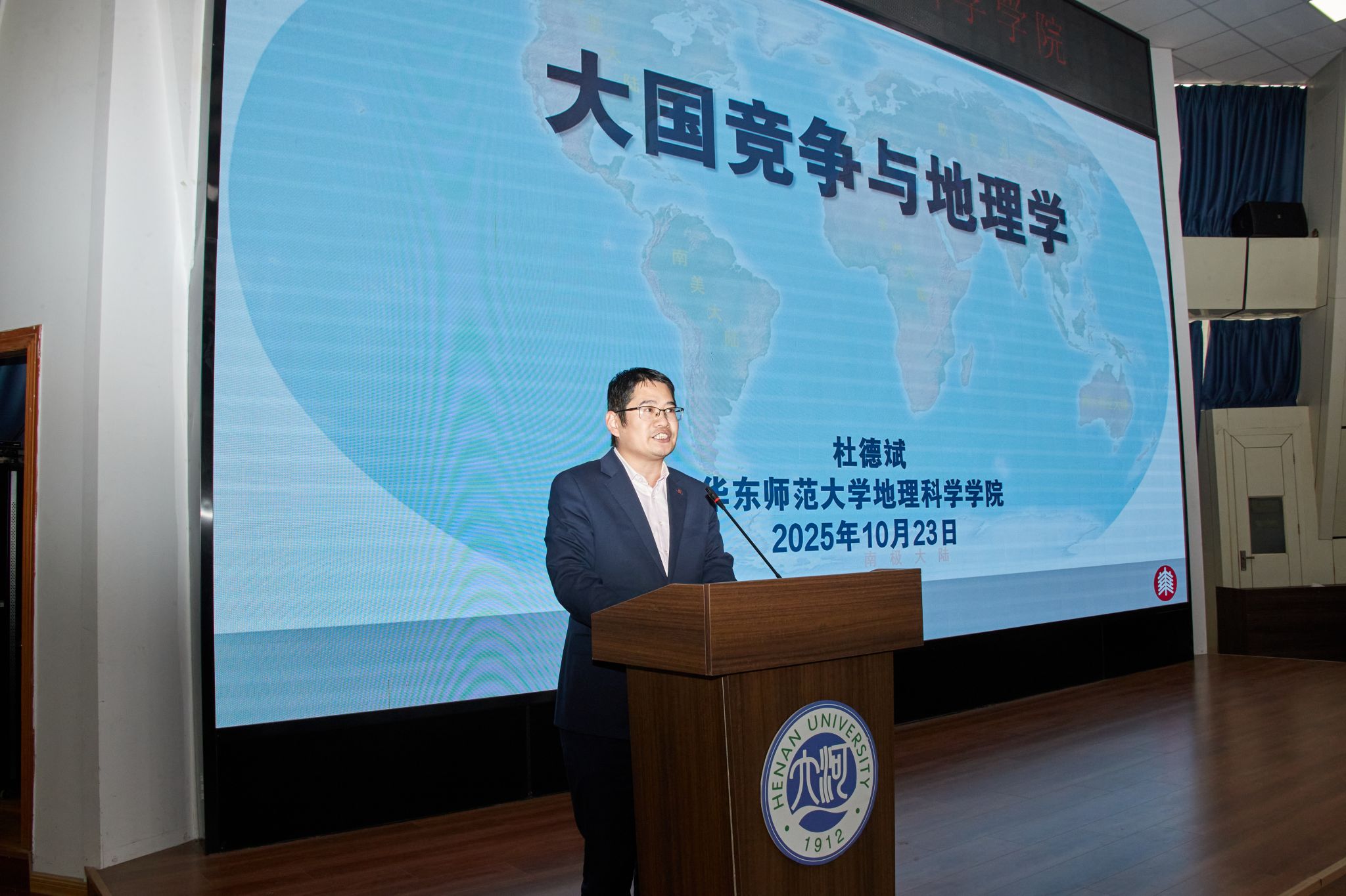 10月23日下午,“百年地学讲坛”第37讲在我校金明校区景兰报告厅举行。教育部“长江学者”特聘教授、华东师范大学地球科学学部主任、全球创新与发展研究院院长杜德斌教授应我部邀请,为师生作了一场题为“大国竞争与地理学”的学术报告。我部学部委员、地理科学学院党委书记乔家君教授等班子成员参加,地理信息科学系主任、信息地理学与地理技术研究所所长翟石艳教授等系所负责人参加了此次报告会。此次报告会吸引了200余名我校师生参会,由地理科学学院副院长丁志伟教授主持。