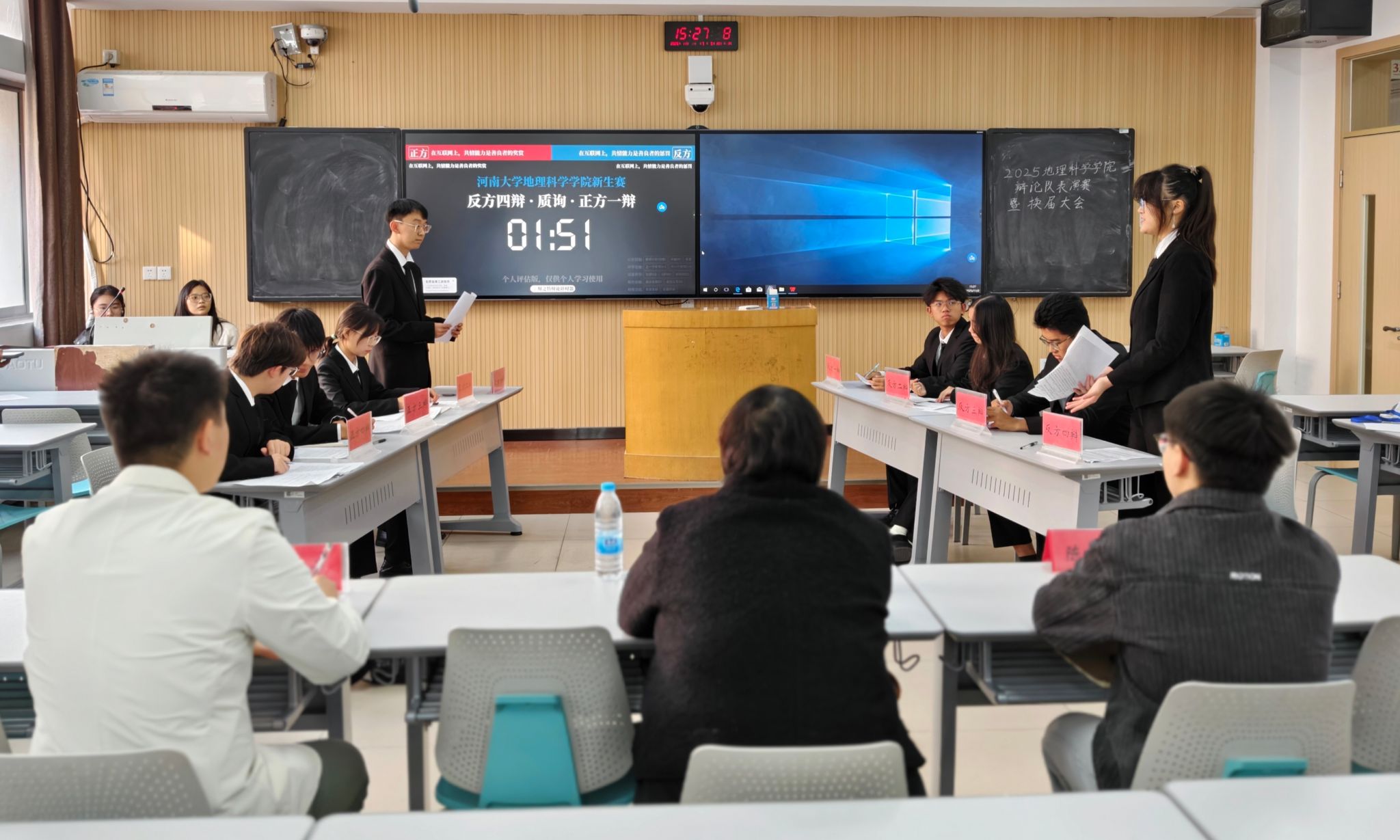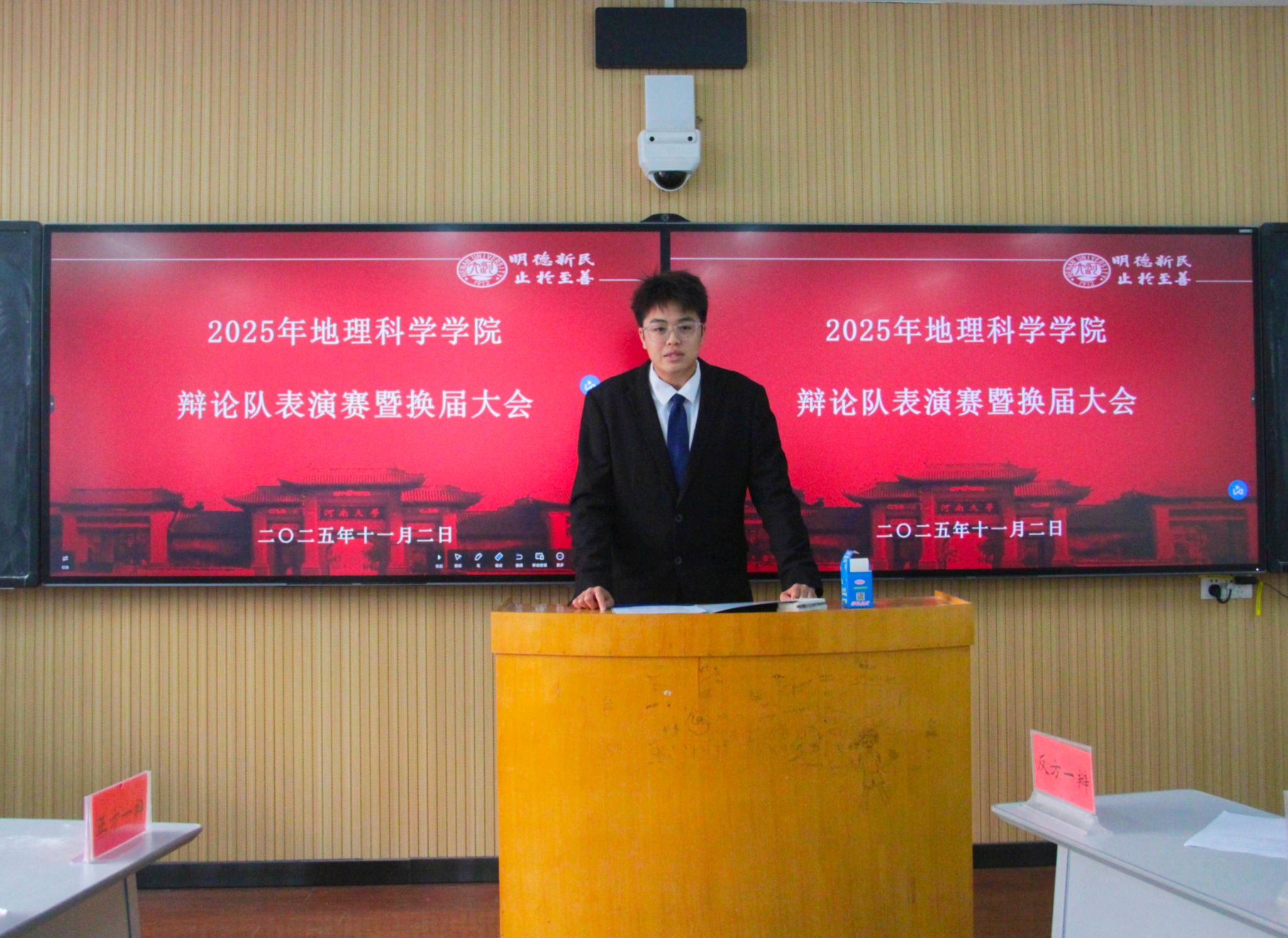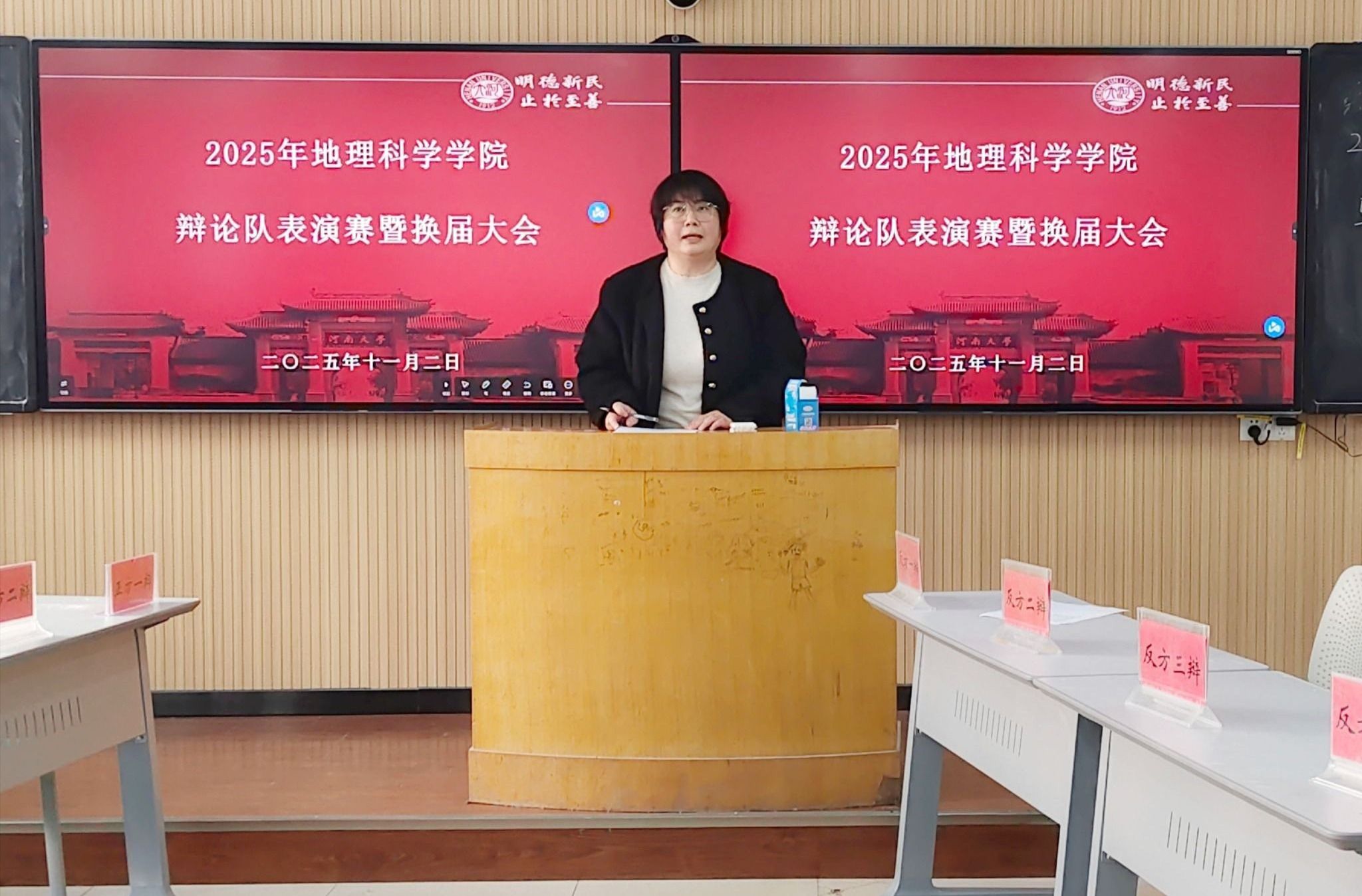 辩共情赏罚,论道启新程;探网间真义,思辨绽芳华。11月2日下午,地理科学学院2025年辩论队表演赛暨换届大会在金明校区综合教学楼3203教室举行。地理科学学院团委负责人冯文璐,2024届辩论队队长陈国玺、李皓文担任比赛评委。学院辩论队全体成员参加大会,会议由2025级本科生马昊远主持。
